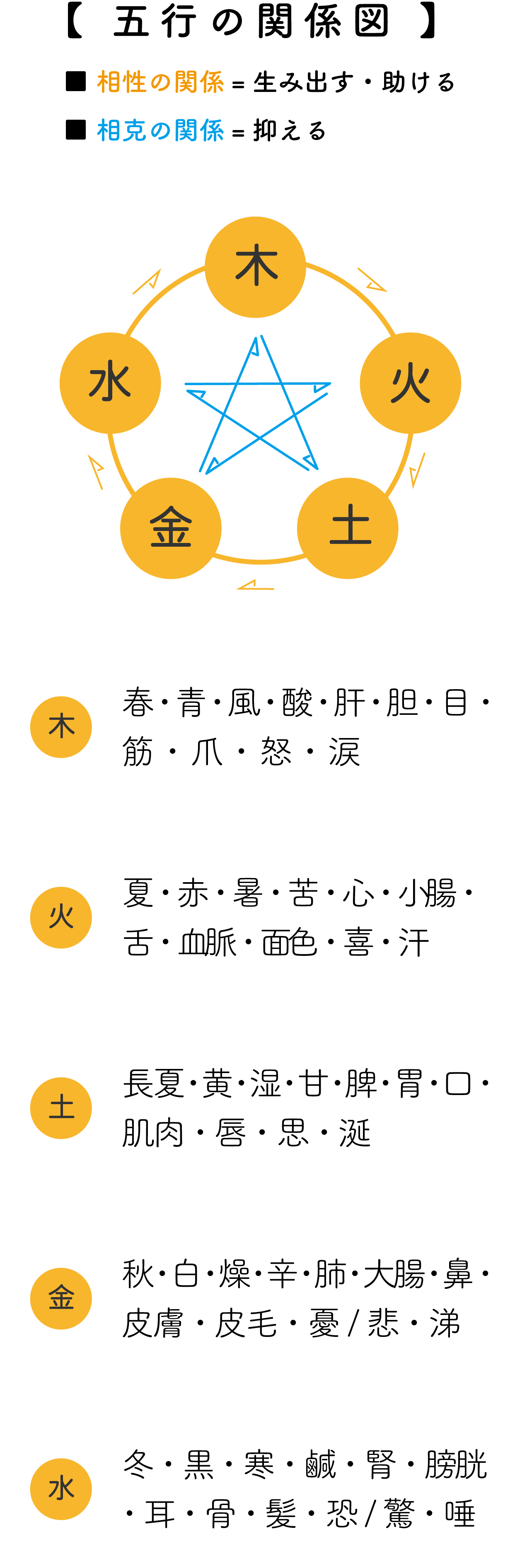 五行の「五」は五つの元素のことで、「行」は動く、めぐる、という意味を表します。万物は「木・火・土・金・水」の五種類の元素からなり、その元素は一定の法則で互いに影響を与えあいながら、変化し、また循環しているという思想です。