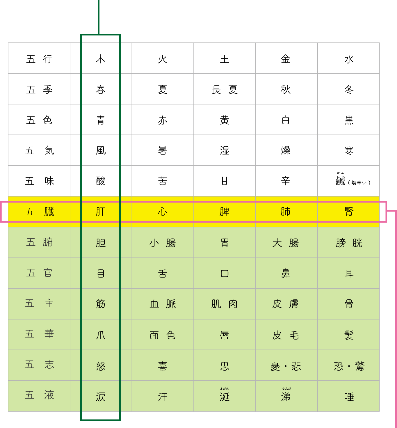 「木」と同じ属性のグループには、「春・青・風・酸・肝・腎・目・筋・爪・怒・涕」が当てはまり、互いに影響しあいながらバランスを保っています。